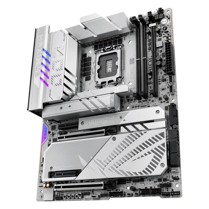 مادربرد ASUS ROG MAXIMUS Z890 APEX با طراحی منحصر به فرد و رنگ سفید خود، به زیبایی هر سیستم گیمینگ اضافه میکند. این طراحی نه تنها جذابیت ظاهری دارد، بلکه به بهینهسازی جریان هوا و خنککنندگی سیستم نیز کمک میکند.