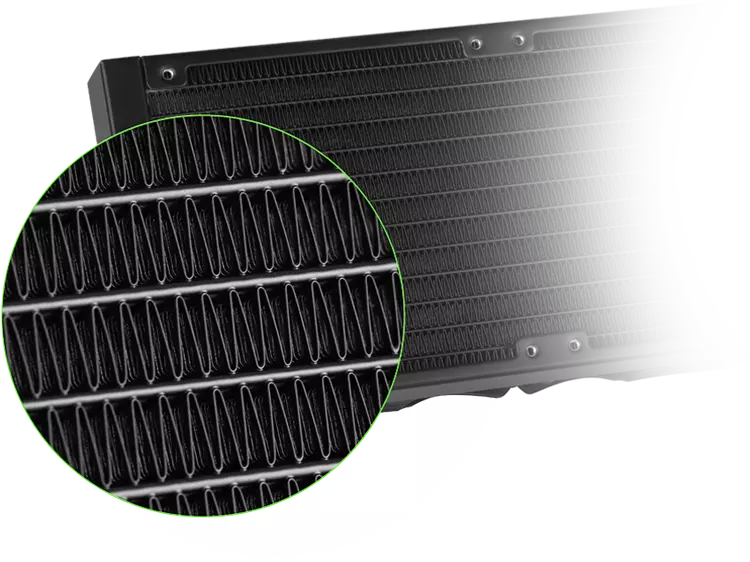 ساختار 0.14mm Micro Channel به کار رفته در هسته تماماً مسی واتربلاک خنک کننده های آبی سری GLACIER ECO ARGB گرین، سطح تماس مایع خنک کننده سیال را با این بخش به طرز قابل توجهی افزایش داده است. این تکنولوژی که یکی از مدرن ترین تکنیک های بهینه سازی واتربلاک محسوب می شود نقش تعیین کننده ای در افزایش راندمان و کارایی خنک کننده های آبی بازی می کند.