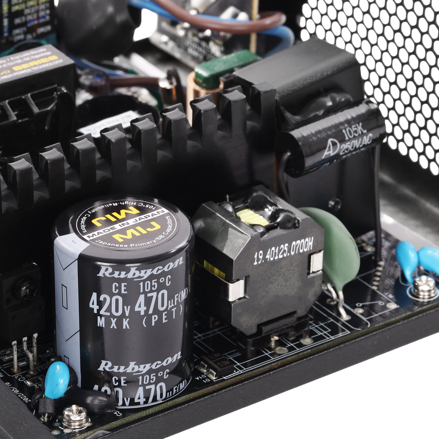 در بخش اولیه منابع تغذیه سری UK EVO از خازنهای الکترولیتی ساخت کمپانیهای ژاپنی معروف Rubycon یا Nippon Chemi-Con با قابلیت کارکرد در دمای 105C استفاده شده است. این خازنها در مقایسه با خازنهای مشابه تایوانی از نوع 85C بیش از 4 برابر عمر بیشتری دارند و بهصورت محسوس در برابر ریپل جریان مقاومترند.