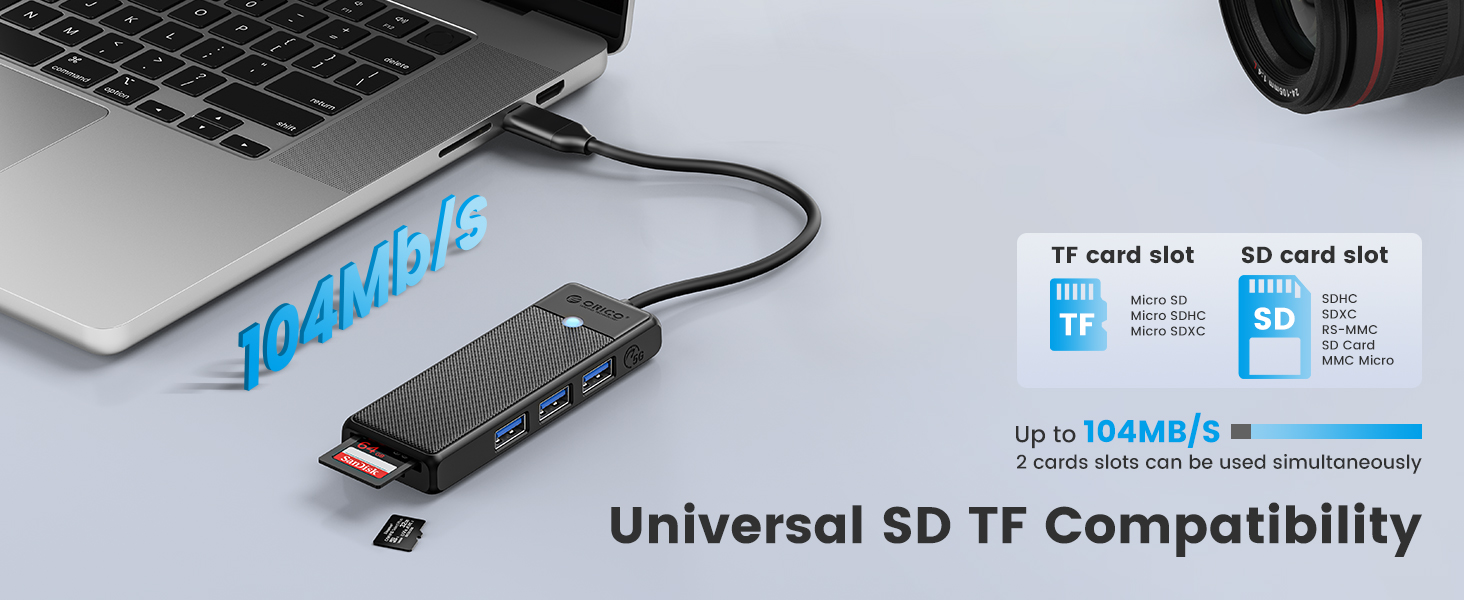 اما این تنها ویژگی جذاب این محصول نیست. این هاب مجهز به یک درگاه کارت حافظه TF/SD است که با همان سرعت 5 گیگابیت بر ثانیه عمل میکند. این امکان را به شما میدهد تا به صورت همزمان از کارت حافظه خود برای انتقال داده یا پخش محتوا استفاده کنید. دیگر نگران سرعت کم و محدودیت در استفاده از کارت حافظه نباشید!