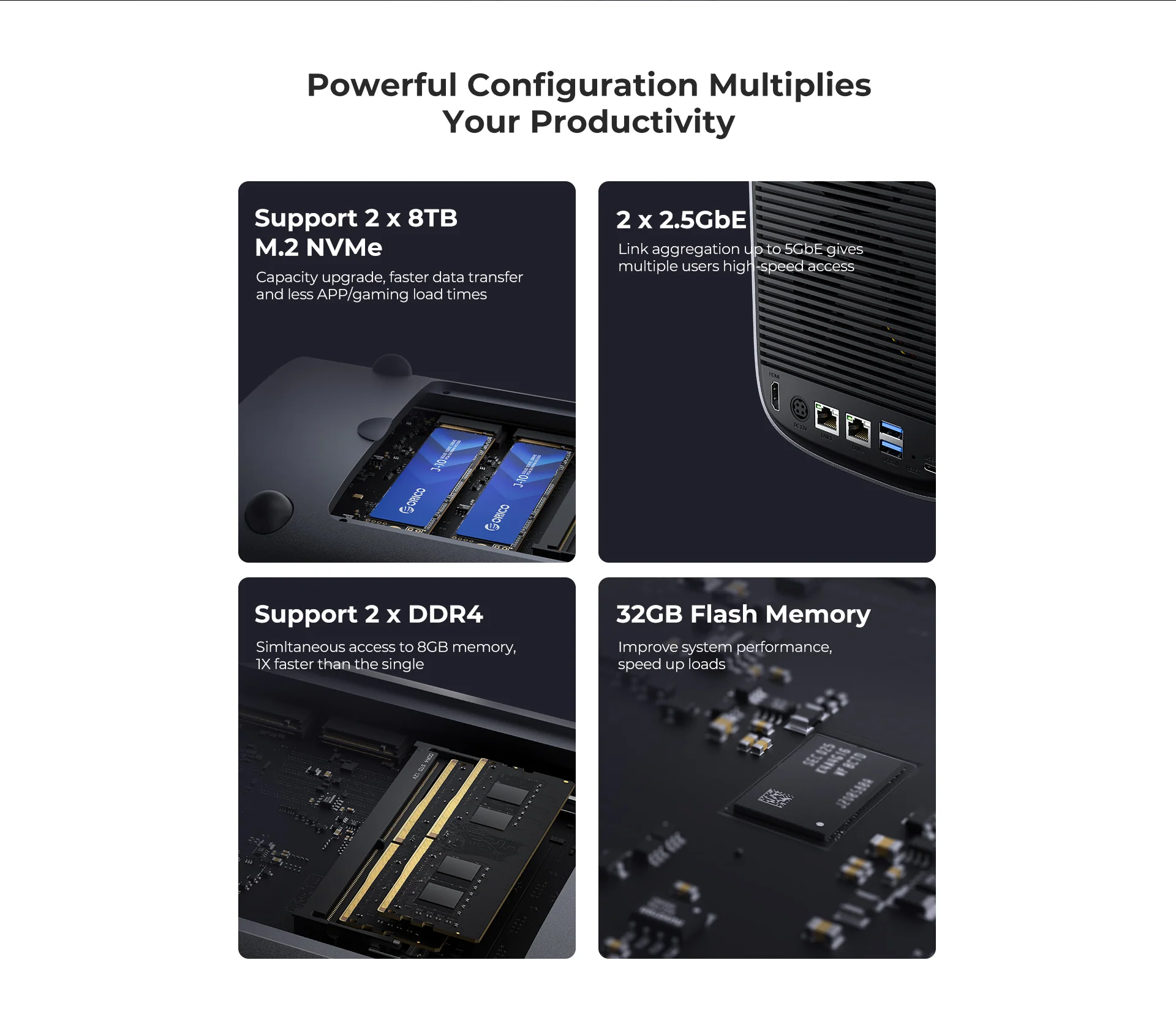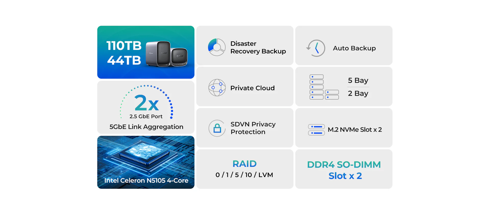 - 5 اسلات SATA3.0: هر اسلات تا ظرفیت 22TB را پشتیبانی میکند. در مجموع، دستگاه میتواند تا 110TB فضای ذخیرهسازی ارائه دهد.